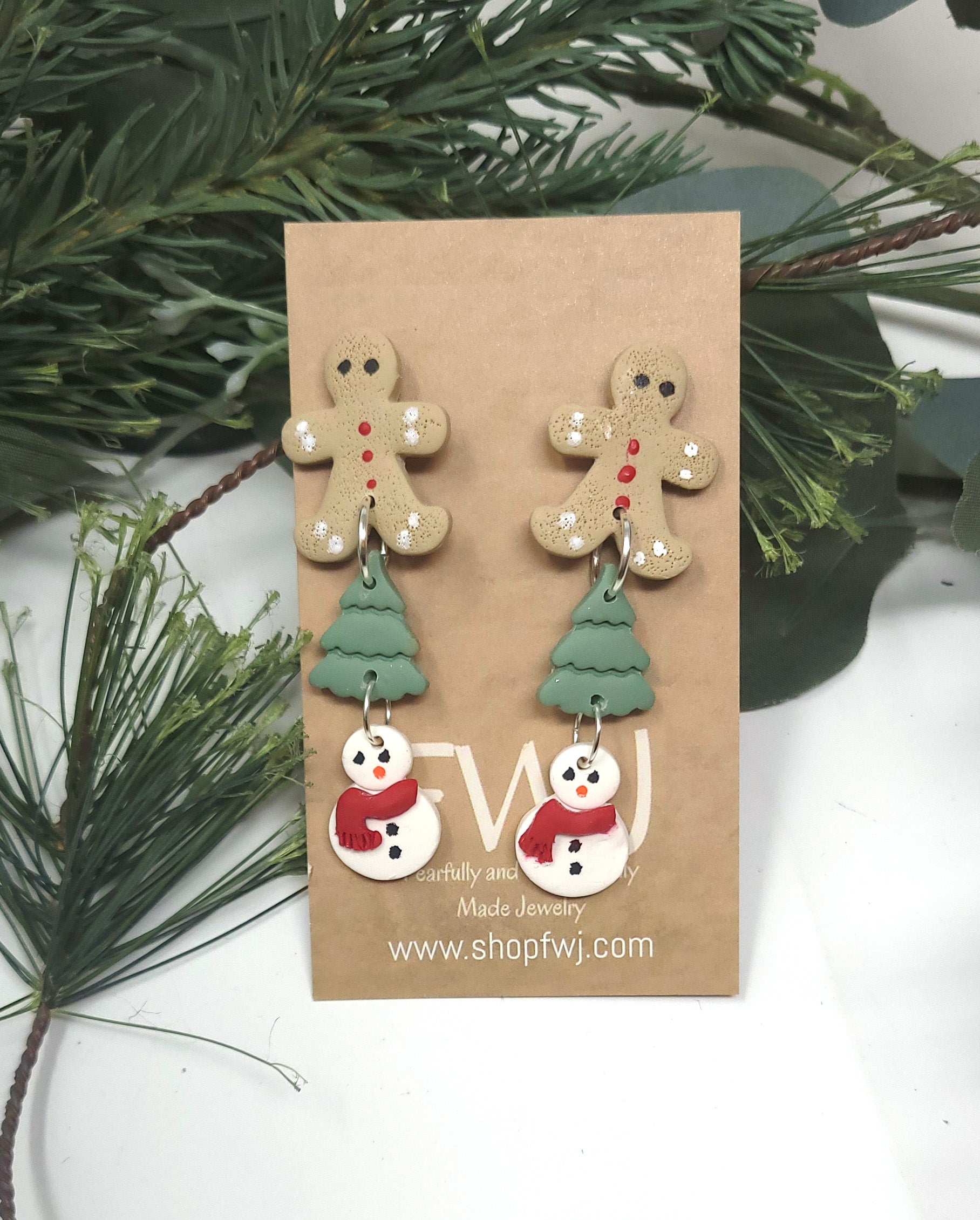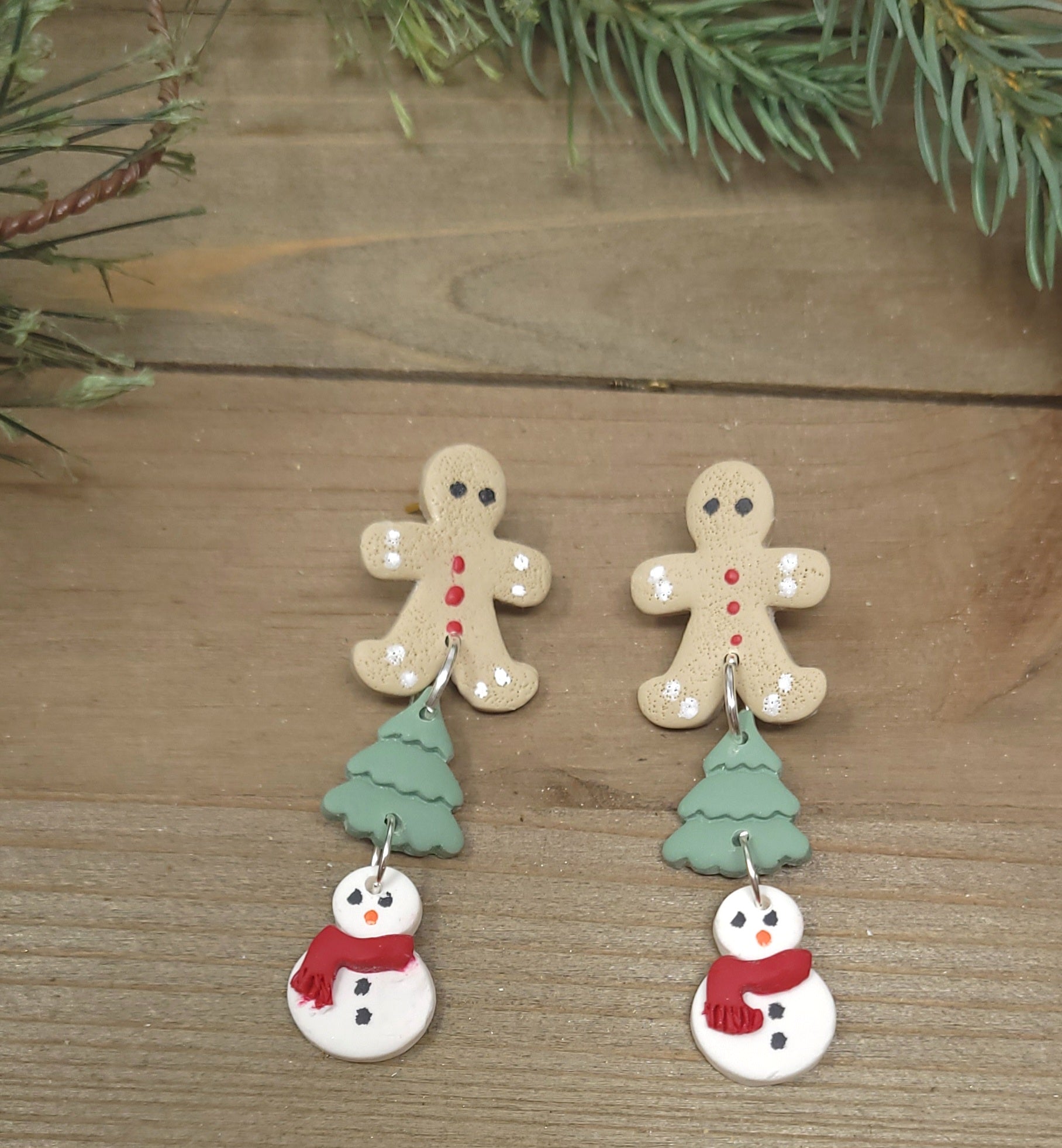 Cascading Christmas earrings made of polymer clay features a gingerbread man, a Christmas tree, and a snowman. All dangling down to about 2.5 inches.