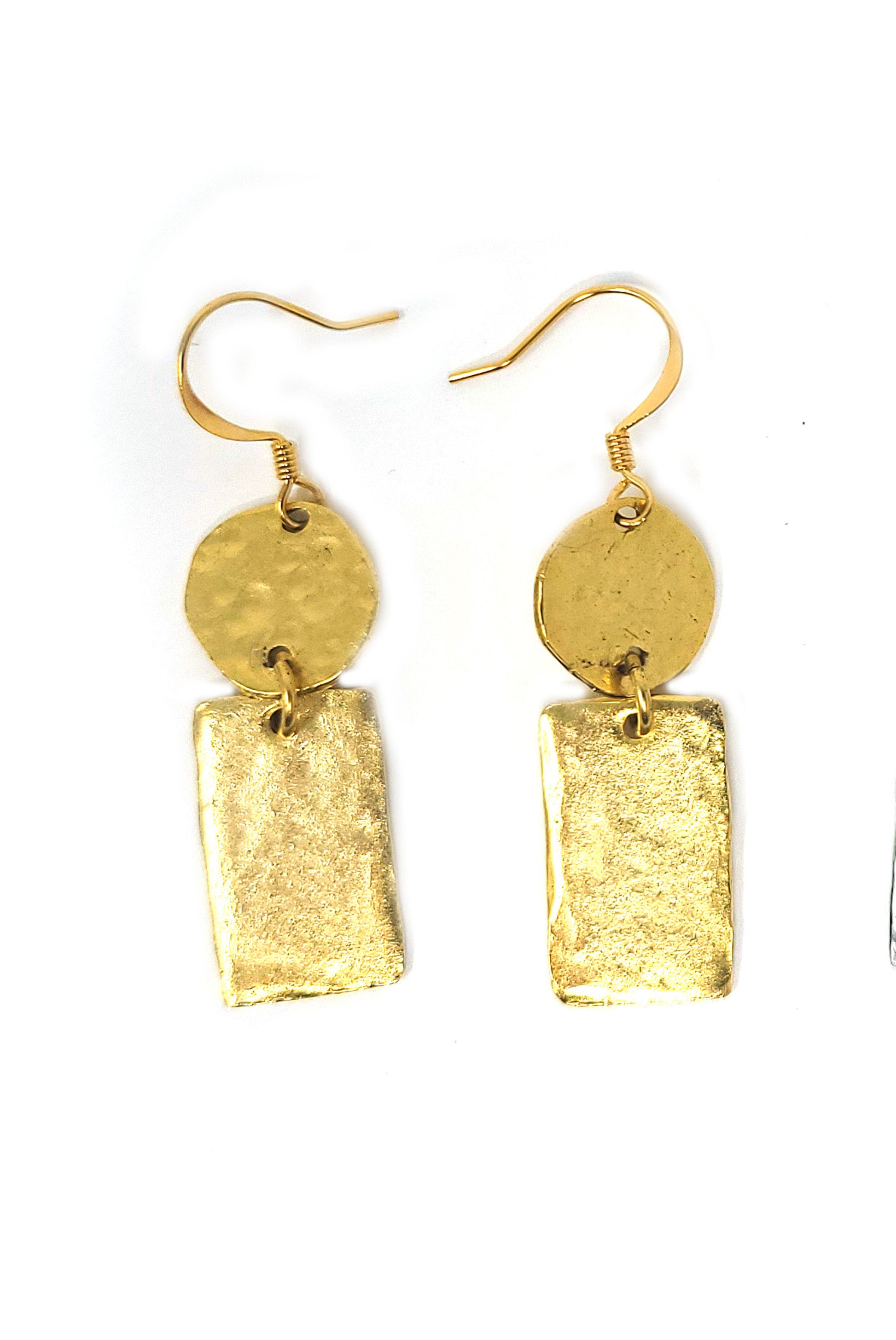 Classic earrings that go with everything. Dress them up or down. Rustic pewter rectangles hang from hammered pewter circular disc in gold or silver with matching earring wire. Lightweight and stylish.